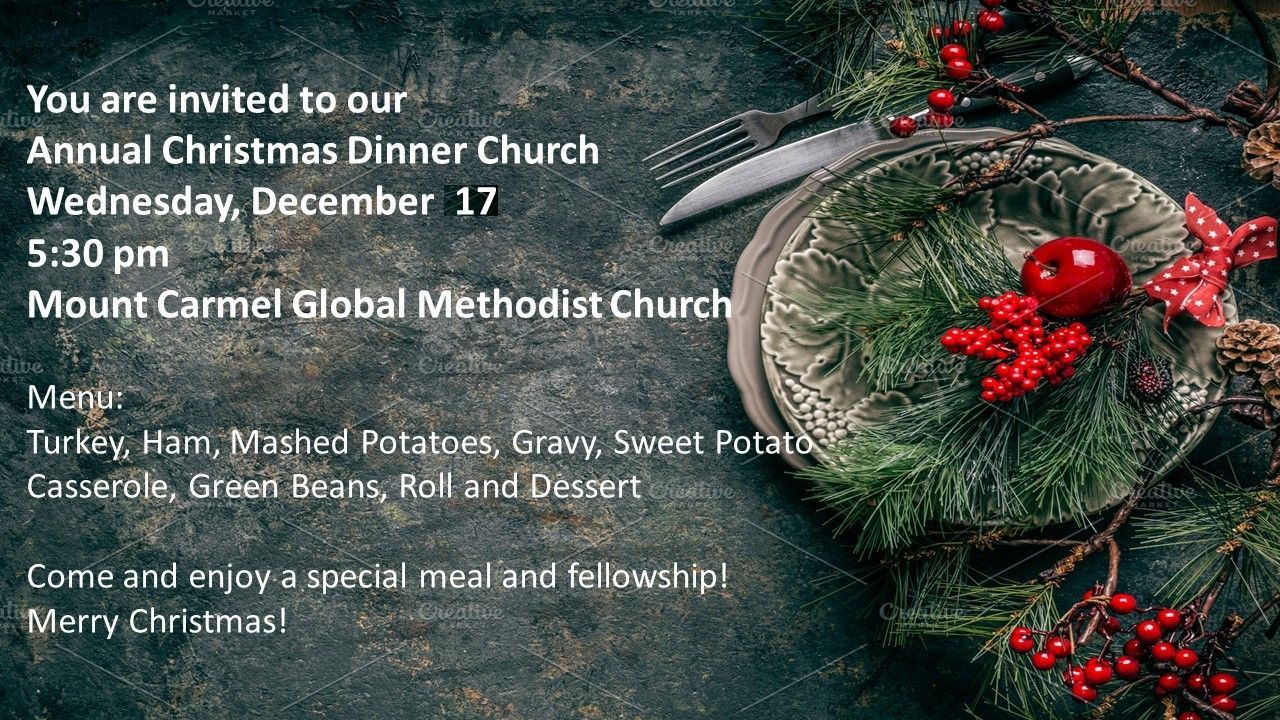 Dec. 17 - Free special Christmas Dinner at 5:30 pm. Turkey, Ham, Mashed Potatoes, Sweet potato casserole, Veggie, roll, and dessert.